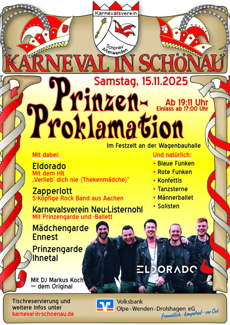 Große Prinzenproklamation am 15.11.2025 Veröffentlicht: 15. Oktober 2025 in der Kategorie Veranstaltungen mit Kommentare deaktiviert für Große Prinzenproklamation am 15.11.2025. Wir suchen DICH / EUCH, den Prinzen bzw. das Prinzenpaar der Session 2025/26.Der Karneval in Schönau hält auch für die neue Session wieder viele Highlights bereit!U.a. bei der Prinzenproklamation mit dabei:Eldorado – ThekenmädcheZapperlott – Rockband aus AachenPrinzengarde Neu-Listernohl Prinzenproklamation am 15. November 2025 Ab 19:11 Uhr im Festzelt an der Wagenbauhalle in Schönau.Einlass ab 17:00 Uhr.Mit dabei u.a.:Eldorado – ThekenmädcheZapperlott – Rockband aus AachenPrinzengarde Neu-ListernohlPrinzenballett Neu-ListernohlMädchengarde EnnestPrinzengarde EnnestUnd natürlich: Rote Funken, Blaue Funken, Tanzsterne, Konfettis und unser MännerballettEine Party mit DJ Markus Koch — dem Original. Bitte aktiviere JavaScript in deinem Browser, um dieses Formular fertigzustellen.Name *E-Mail *Anzahl Plätze *Eine Reservierung ist ab 8 Personen möglich!Sonstige HinweiseDatenschutz *Datenschutzhinweise gelesen.Mit dem Absenden des Kontaktformulars erklären Sie sich damit einverstanden, dass Ihre Daten zur Bearbeitung Ihres Anliegens verwendet werden (Weitere Informationen und Widerrufshinweise finden Sie in der Datenschutzerklärung).WebsiteReservieren ...